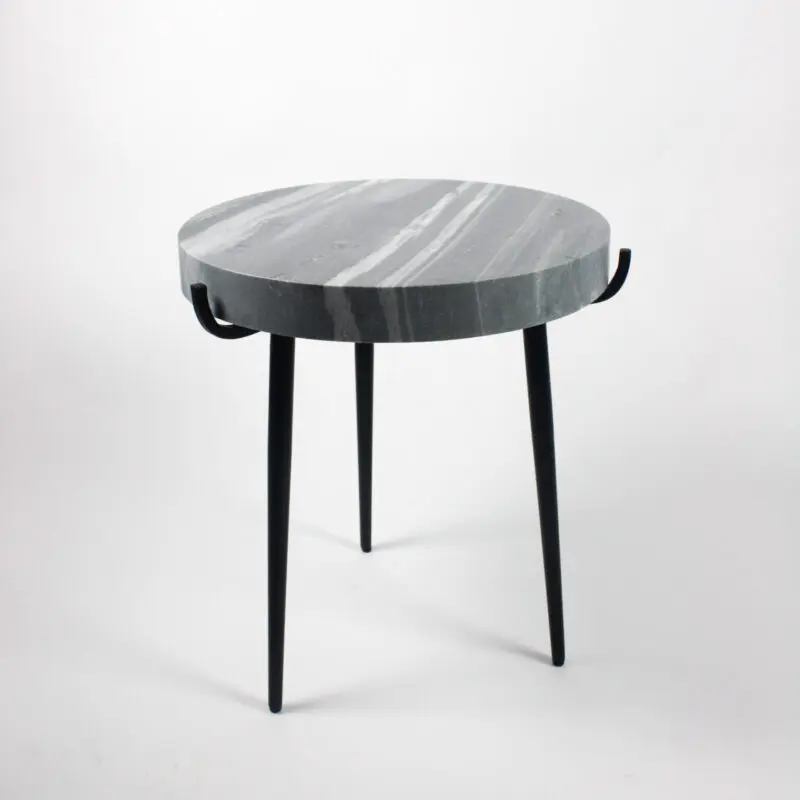 Marwin is a side table made of gray marble with an iron base. The veining in various shades running through the polished stone makes each table unique – it's nature's touch.