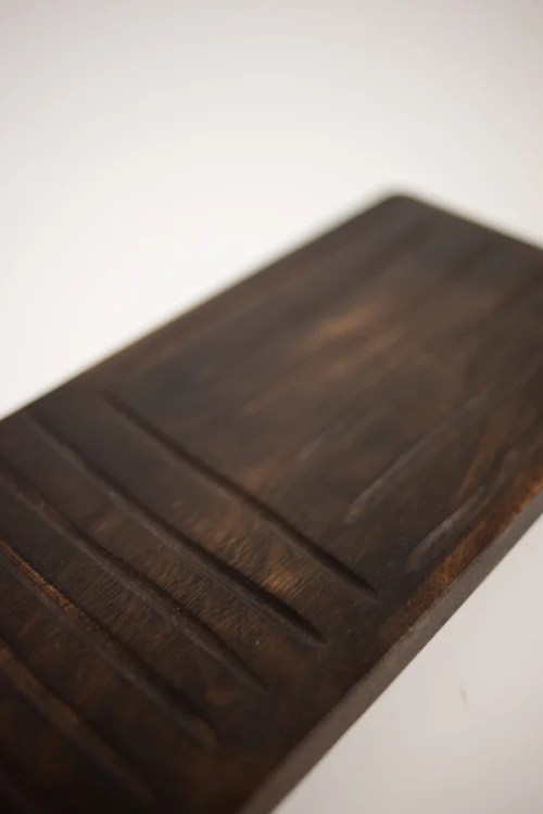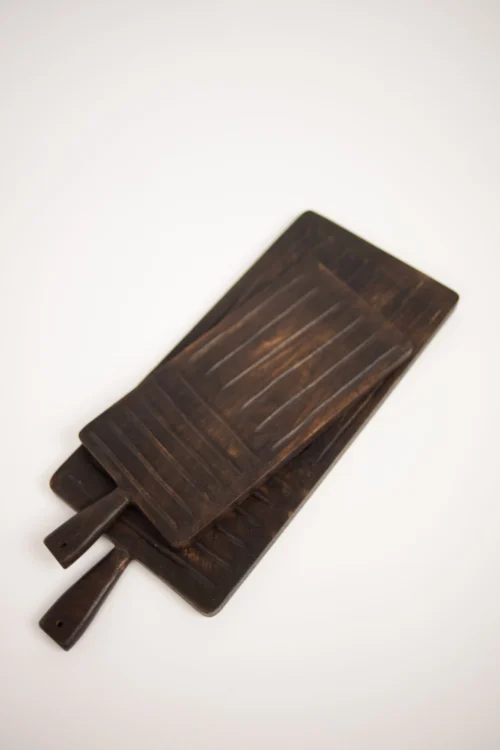 The surface of the serving board is burnt, which gives it character. To preserve its beauty and lifespan, it is recommended to clean it with a damp cloth and mild detergent after use.