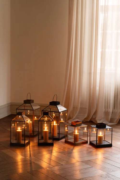 - Assurez-vous de placer la bougie au centre de la lanterne afin qu'il y ait suffisamment d'espace pour que l'air circule entre la bougie chauffe-plat et la bougie.