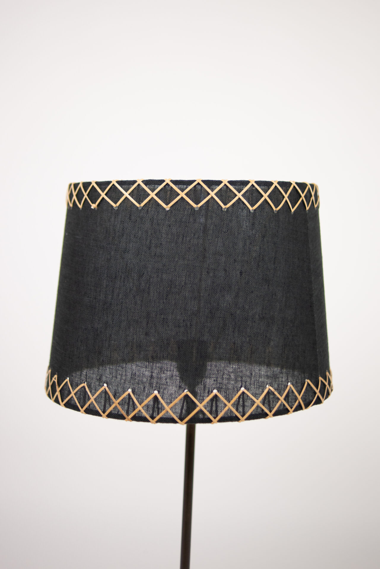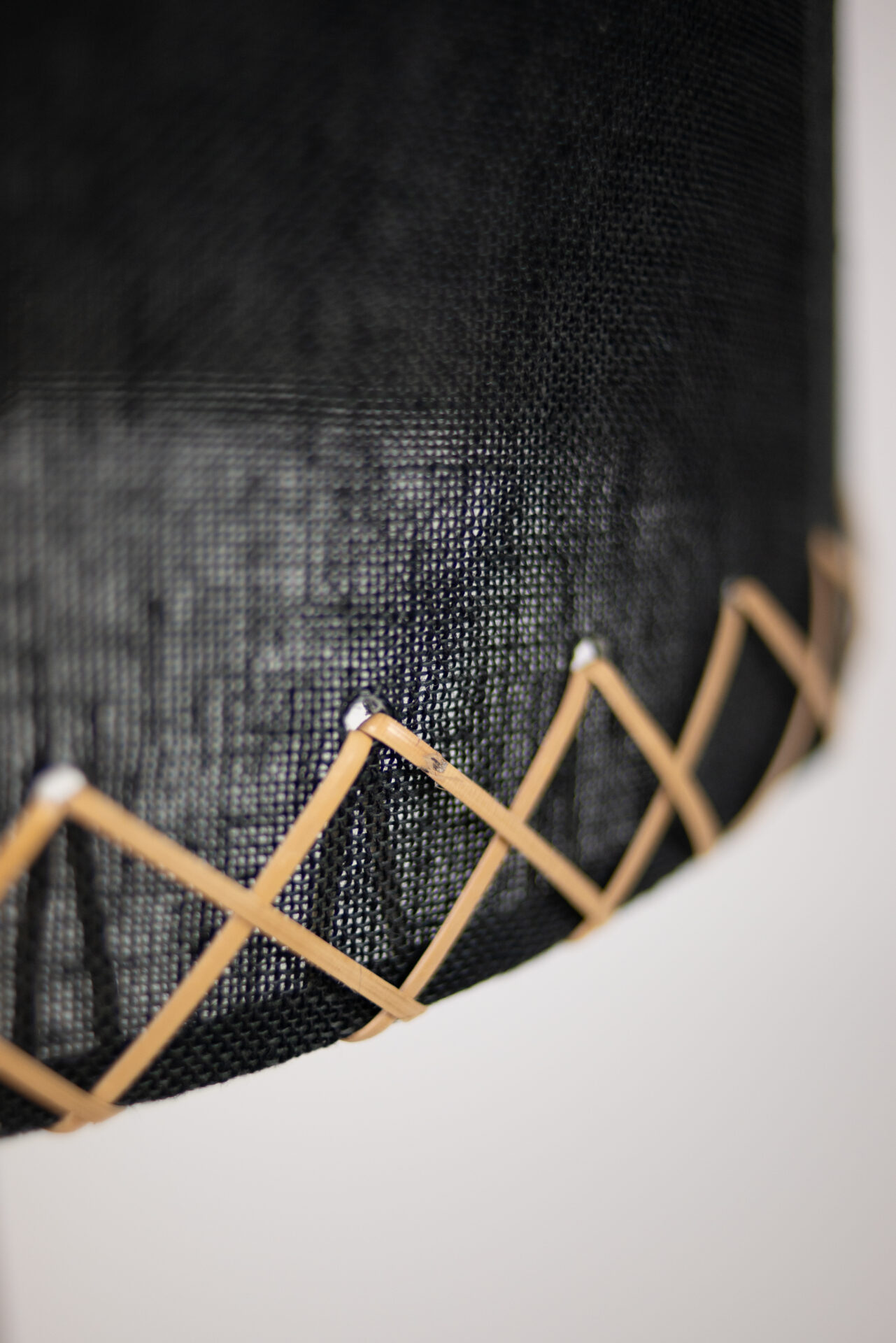 Abat-jour en lin avec croisillons décoratifs en rotin sur les bords supérieur et inférieur.