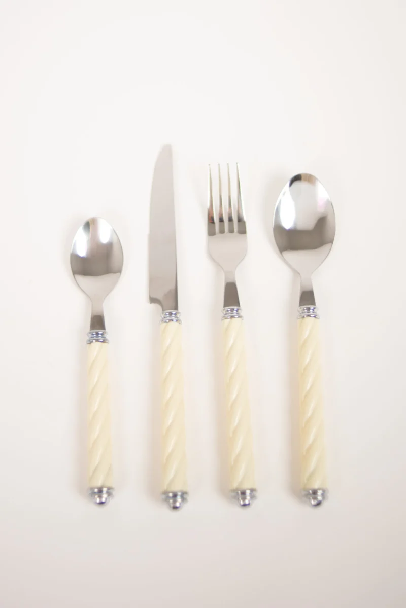 Bestick i rostfritt stål med rundade handtag i slitstark plast.