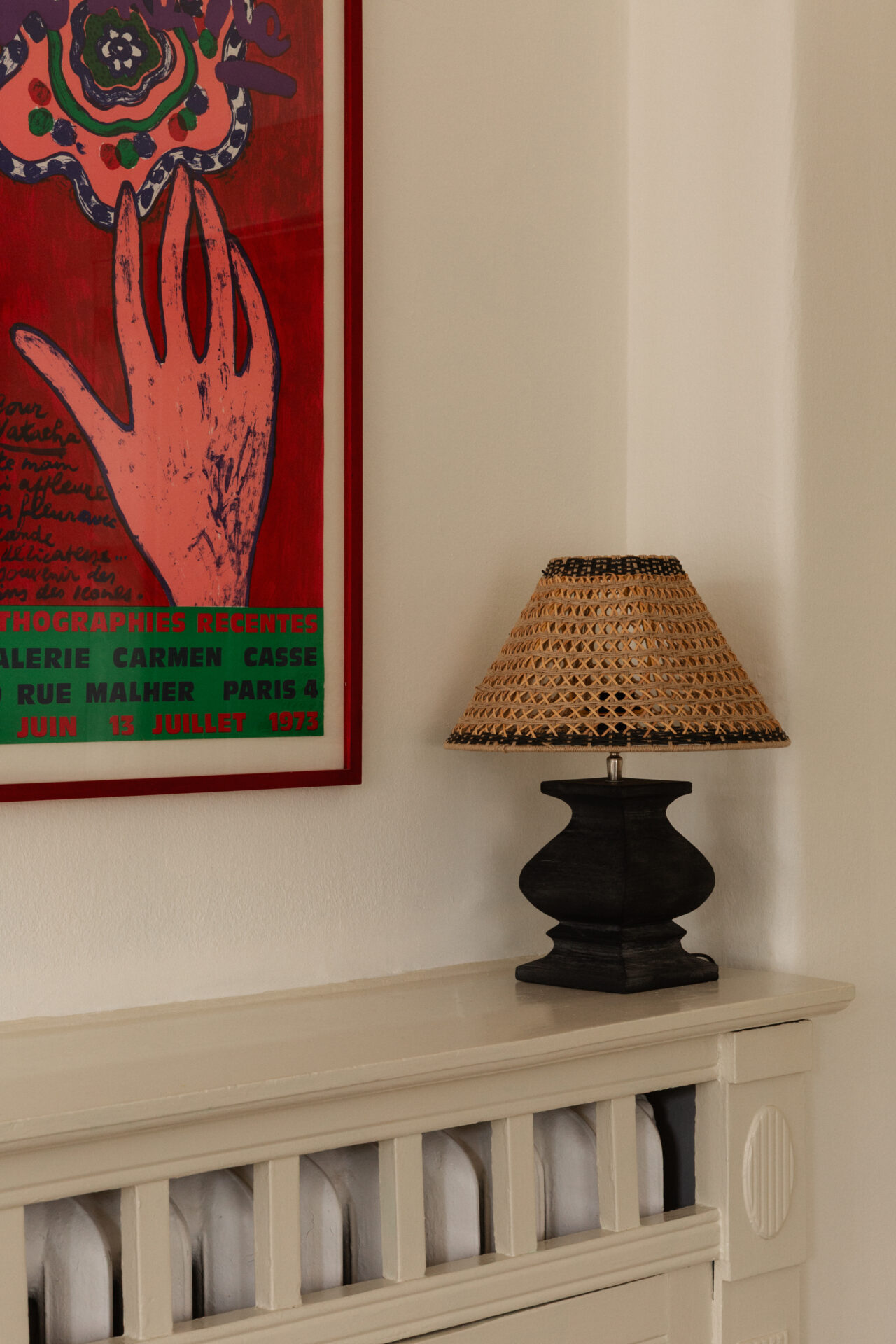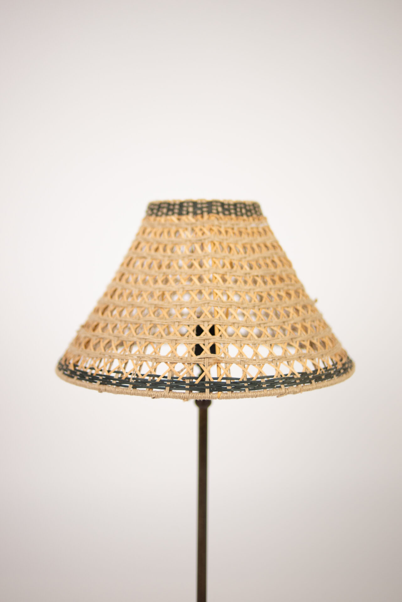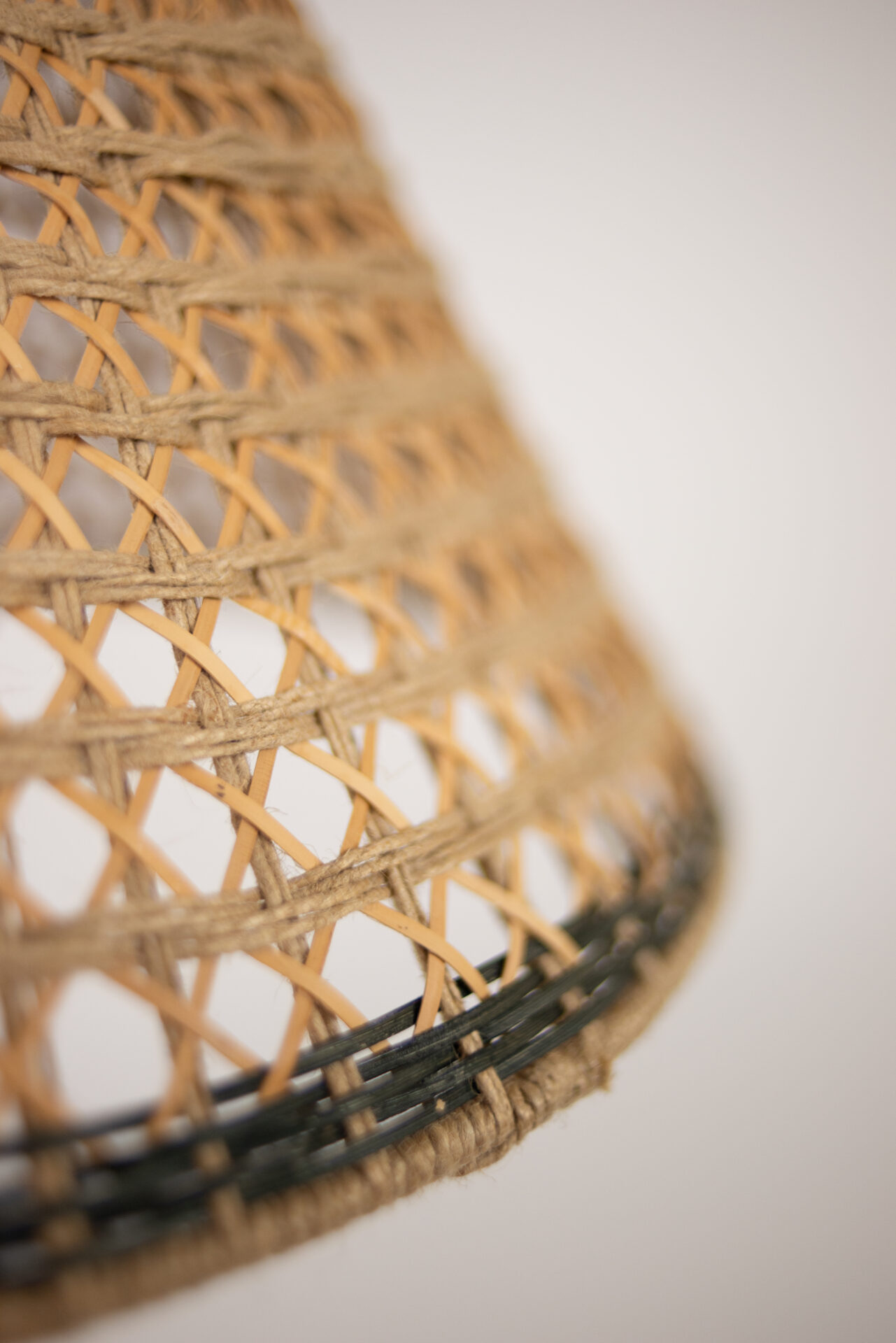 Lampskärm i rotting och jute som sprider ett mjukt och vackert sken genom dess öppningar.